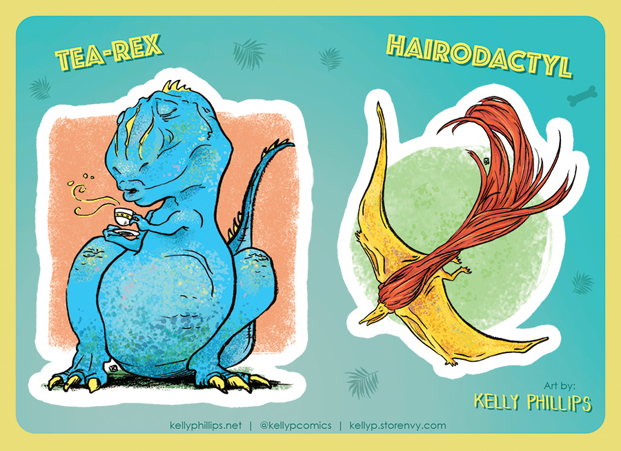 Tea Rex and Hairodactyl DinoPuns! Share these prehistoric puns as STICKERS! (Two sheets, 4 stickers total)