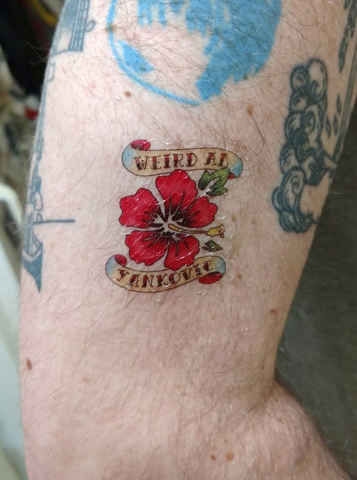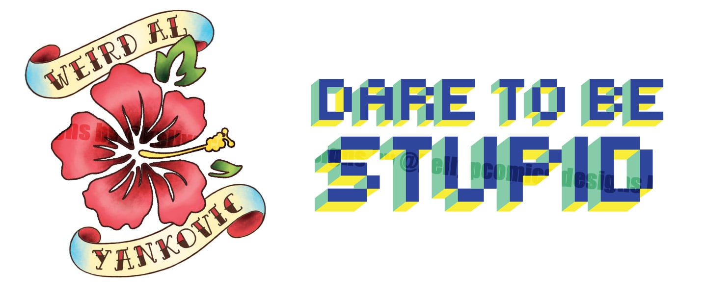 Temporarily wear your fandom with pride with a SIX PACK of tattoos! You'll receive 3 tattoos of both designs (6 total): Dare to be Stupid and the "Weird Al" Yankovic flower.